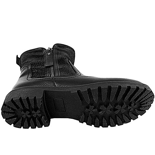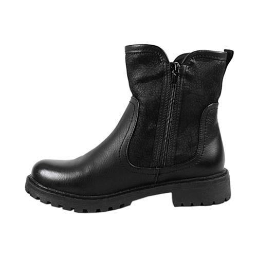 Dejlig 5th Avenue vinterstøvle med en overdel af imiteret glat skind og tekstil med en pyntelynlås på ydersiden af anklen. Støvlen lukkes med en lynlås på indersiden af anklen, og en trækfane bagpå gør det nemt at træde i støvlen. Indvendig har skaftet et blødt plysfoer, imens resten af støvlen har et blødt, lunt fleecefoer, og indersålen er blød og behagelig. Den kraftige og godt mønstrede gummiydersål er stødabsorberende med et godt vejgreb.