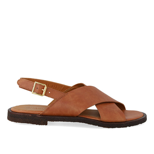 Lækker slingback-sandal med en overdel af glat skind i et flot krydsremsdesign. Sandalen lukkes med et spænde på ankelremmen. Dæksålen er beklædt med kromfrit skind, imens den mørkebrune og FSC-certificerede rågummiydersål er fleksibel og stødabsorberende med et fint fodfæste, og naturgummiet er genanvendeligt. Fås i halve størrelser. Udformet i naturligt og åndbart skind. Designet i Danmark og håndlavet med kærlighed i Portugal.