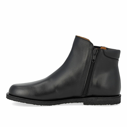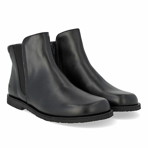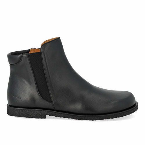 Lækker ankelstøvle i glat skind med et smalt elastikpanel på ydersiden og en lynlås på indersiden af anklen. Bagerste halvdel af åbningen er polstret. Med en normal til bred vidde er der mere plads om forfoden. Indvendig har støvlen et kromfrit skindfoer. Indersålen er komfortabel, og ydersålen af FSC-certificeret rågummi er stødabsorberende. Fås i halve størrelser.