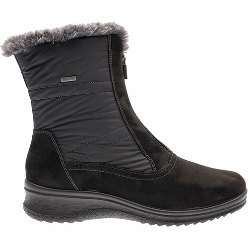Dejlig München vinterstøvle med GORE-TEX. Overdelen er af tekstil og syntet med en kant af imiteret pels i åbningen. Støvlen lukkes med en central lynlås ned over vristen. Indvendig har støvlen et varmt foer, og med en åndbar og vandtæt GORE-TEX-membran holdes fødderne varme og tørre. Med vidde H er der plads til den bredere fod. Med en smule hælhøjde i kilehælen får du et feminint look med den fleksible Tecno Rubber-ydersål, som er stødabsorberende med et godt fodfæste.