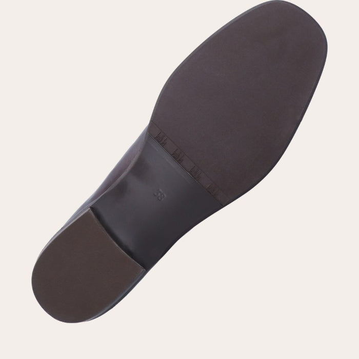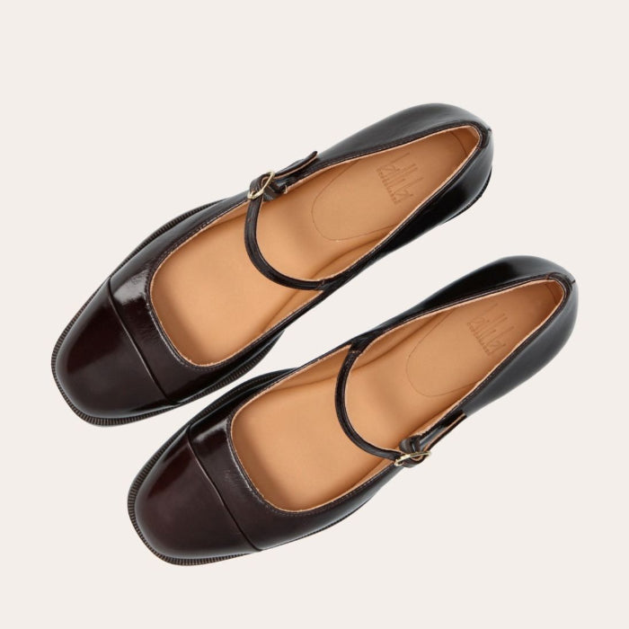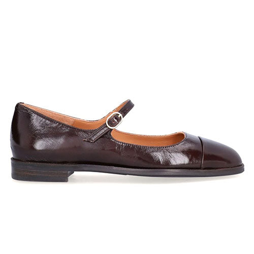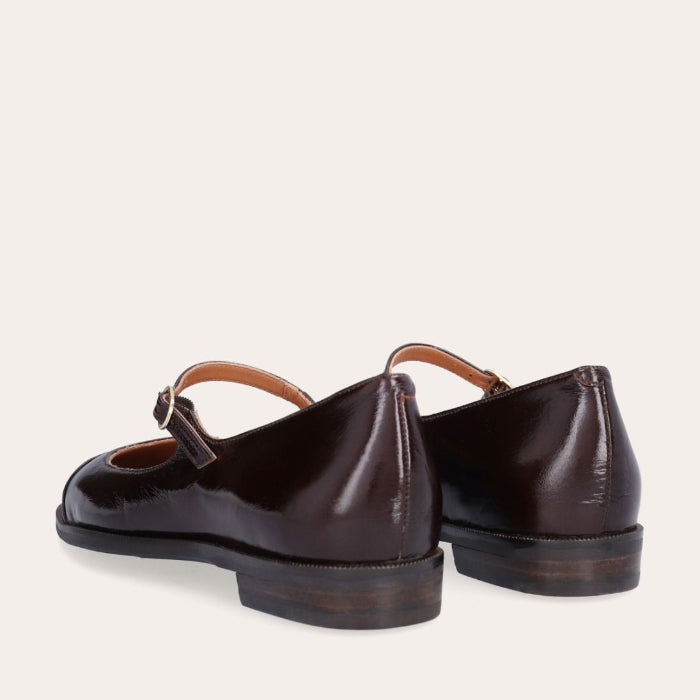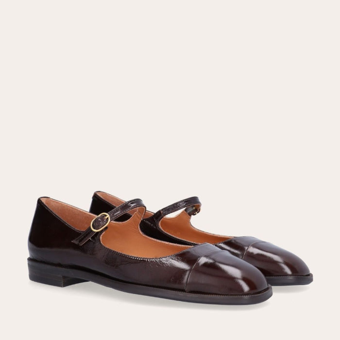 Superlækker Mary Jane sko fra Billi Bi. Denne håndlavede sko er udført i mørkebrunt lakeret skind med firkantet snude med sort lakskind. Skoen lukkes med en smal rem med et lille guldfarvet spænde. Skoen har et skindfoer og en polstret indersål, og ydersålen giver et fint fodfæste.