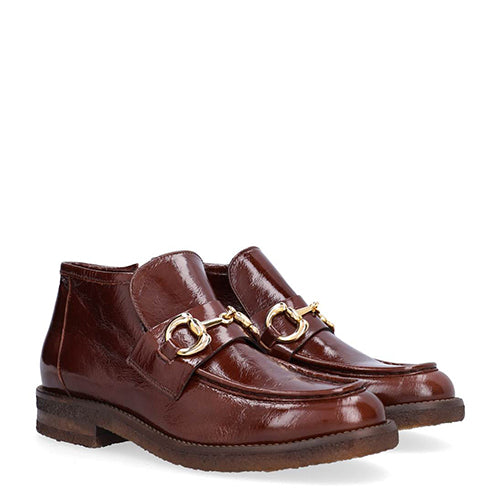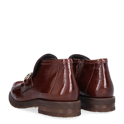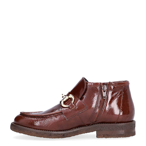 Håndlavet Venice ankelstøvle med en overdel af lakeret skind med rund tå og moc toe-syning, dekoreret med et guldfarvet bidsel over vristen. Støvlen lukkes med en lynlås på indersiden af anklen. Indvendig er støvlen foret med skind, og indersålen er blød. Den fleksible rågummiydersål er stødabsorberende med et godt fodfæste.