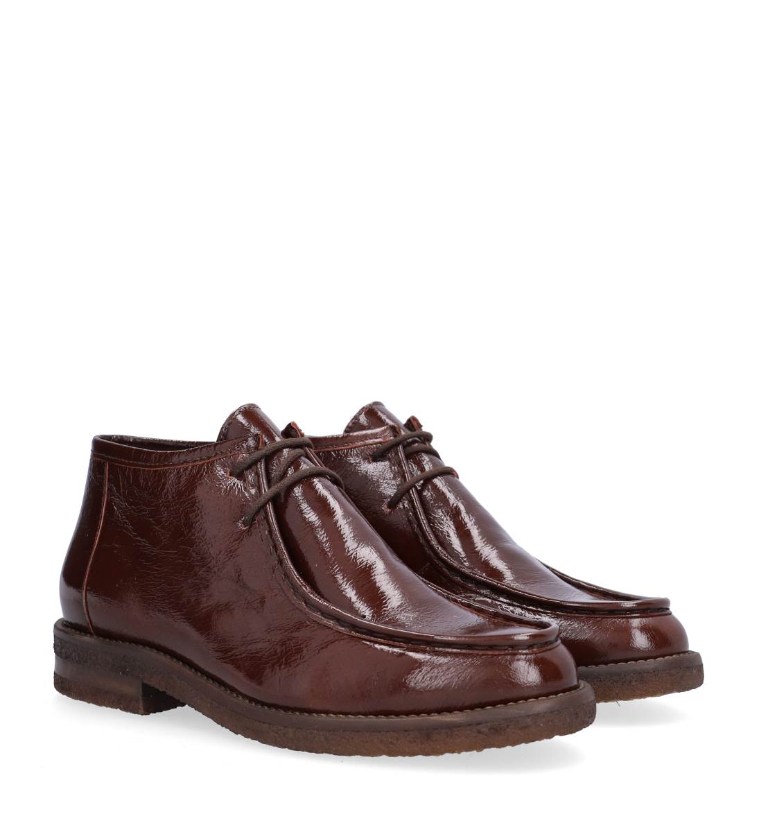 Håndlavet Venice desert boot med en overdel af lakeret skind med rund tå og moc toe-syning. Støvlen lukkes med snørebånd. Indvendig er støvlen foret med skind, og indersålen er blød. Den fleksible rågummiydersål er stødabsorberende med et godt fodfæste.