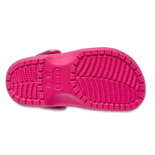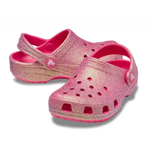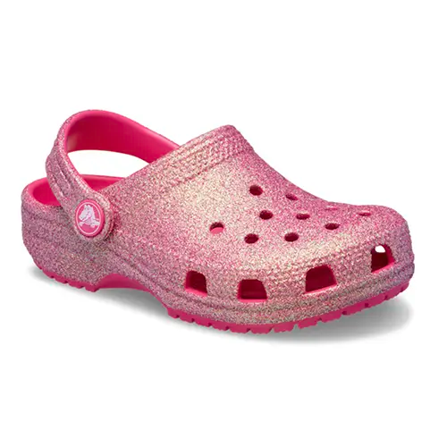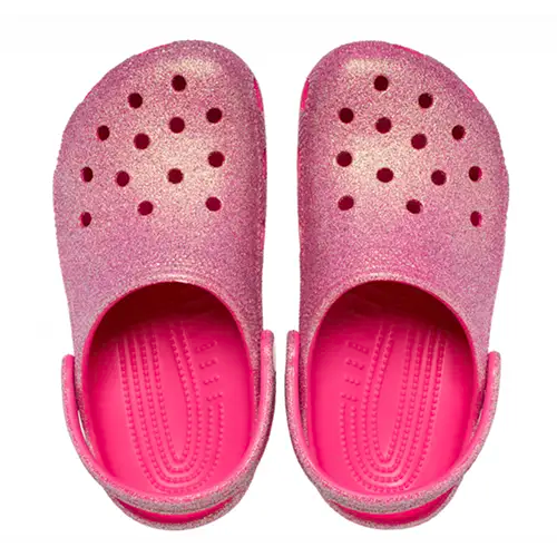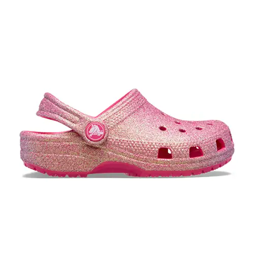 Den originale Crocs Classic Iridescent Glitter cgk sandal til børn er utrolig let og sjov at have på og er samtidig vandvenlig og flydende. Med en overdel af EVA med ventilationsporte kan fødderne ånde, og vand kan nemt sive ud. Drejelige hælstropper sørger for, at skoen bliver på foden, og de kan drejes op på vristen for en slippers-model. Ydersålen er stødabsorberende og giver et fint fodfæste. Nem at rengøre og hurtig at tørre.
