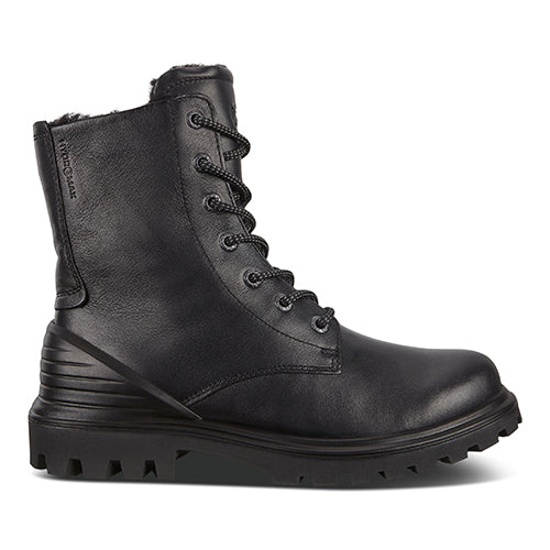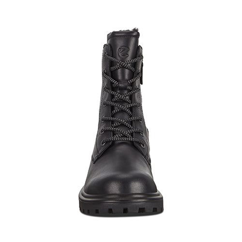 Denne workwear-inspirerede ECCO TREDTRAY K-støvle er en alsidig og stilfuld ankelstøvle, som holder fødderne varme og tørre takket være den innovative, vandafvisende læderbehandling (ECCO's HYDROMAX®-teknologi) og det varme uldfoer. Overdelen er af glat skind, og støvlen justeres med snørebånd og lukkes med lynlås på indersiden af anklen. Den udtagelige indersål er belagt med aluminium og isolerer derfor mod kulden. Den lette PU-mellemsål giver masser af affjedring, mens det grove mønster i gummisålen sikrer et slidstærk og godt greb i underlaget. ECCO FLUIDFORM™ Direct Comfort-teknologi giver fødder i voksealderen den nødvendige støtte og komfort.