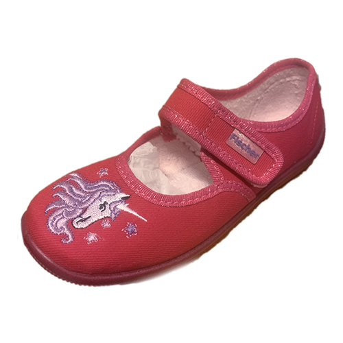 Sød Melly hjemmesko i Mary Jane-stil fra Fischer. Overdelen er tekstil med et broderet enhjørningehoved på snuden. Skoen lukkes med en velcrorem over vristen. Er foeret med frotté, og indersålen er blød og polstret. Ydersålen er meget fleksibel og giver et godt fodfæste.