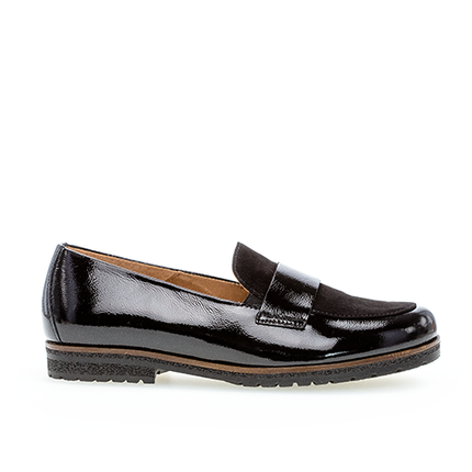 Flot loafer af laklæder, pyntet med en rem af laklæder henover vristen. I siderne af åbningen er isat elastik, så skoen bedre tilpasser sig din fod. Indersålen er blød og komfortabel, og den halvgrove ydersål giver et godt fodfæste. Her får du et par loafers perfekt til både hverdag og fest.
