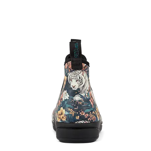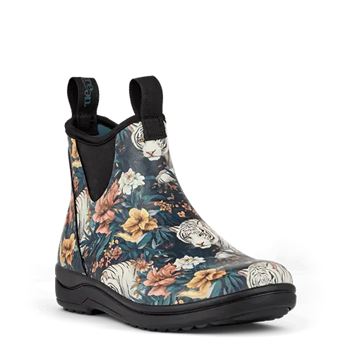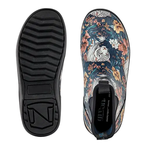 Superlækker Rain Rafaell - Tiger gummistøvle med en hidtil uset komfort. Det kraftige, bløde gummi holder vandet ude og dine fødder tørre. I gummistøvlen får du Green Comforts unikke 4,5 mm EnergySole™ Shape-indersål med indbygget svangstøtte og ekstra skum under hæl og forfod, som sikrer dig optimal stødabsorbering og komfort til gavn for hele din krop. Gummistøvlen er lavet på den rummelige H-læst, som giver god plads til dine fødder. Det bløde og elastiske neoprenfoer samt de to trækfaner gør det nemmere at træde i støvlen, som er dejlig at have på. Ydersålen er stødabsorberende med et godt vejgreb.