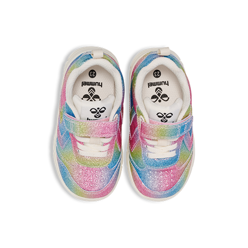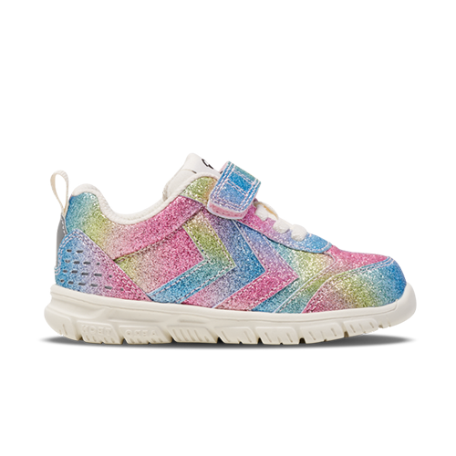 Superflot og superlet Crosslite Glitter Infant sko med en overdel af multifarvet glitter med refleksdetaljer på hælen for øget synlighed. Overdelen bærer hummels klassiske vinkler på begge sider af skoen. Lukkes med en klipbar velcrorem over vristen, imens en ikkejusterbar elastiksnøre sørger for løbende tilpasning til foden igennem dagen. Åbningen er polstret for øget komfort og beskyttelse, og en trækfane på hælen gør det nemt at træde i skoen. Den udtagelige indersål har en Fit Zone-afmærkning af voksetillæg, og når du vælger skostørrelse til dit barn, anbefaler vi 1 til 1,5 cm i voksetillæg. Den lette og fleksible Aerotech-EVA-ydersål er stødabsorberende og giver høj komfort.