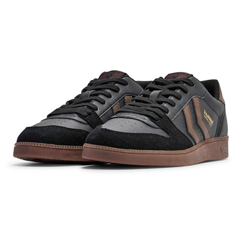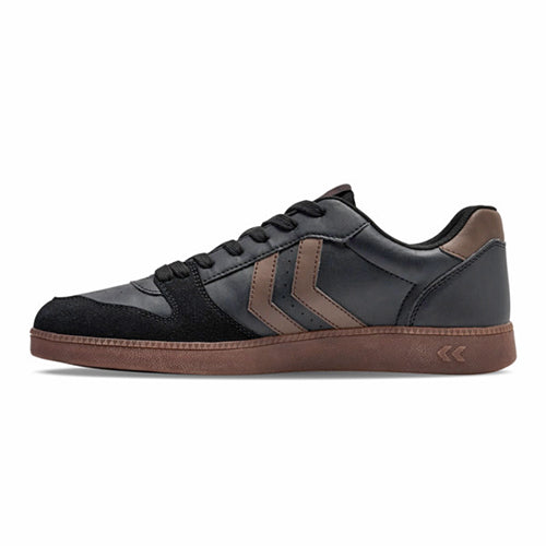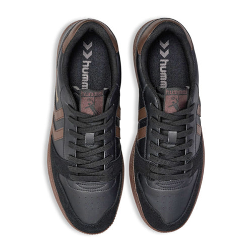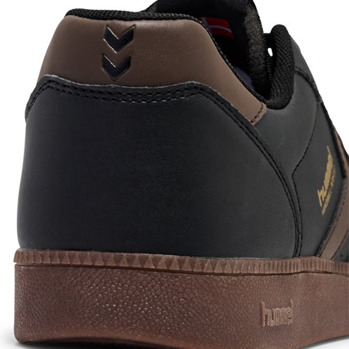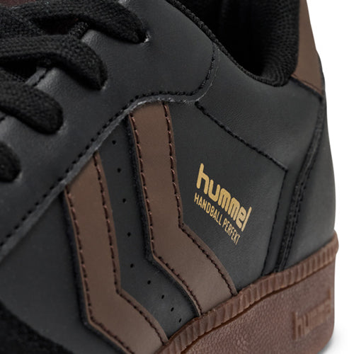 Let og lækker Handball Perfekt SP sneaker fra hummel. Overdelen er af imiteret skind med brune chevrons på siderne og hælen. Skoen justeres og lukkes med snørebånd, og åbningen er polstret for øget komfort. Den udtagelige indersål er polstret og komfortabel, og den fleksible ydersål er stødabsorberende med et godt fodfæste.