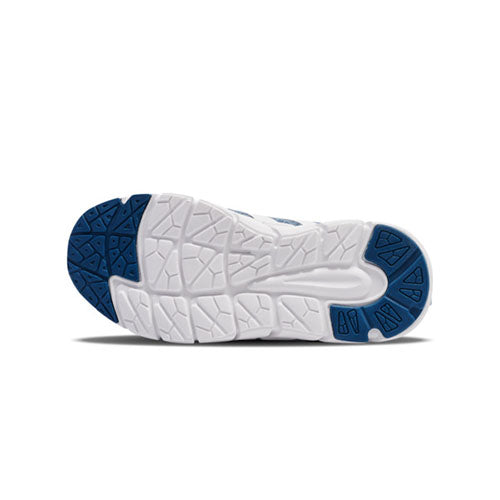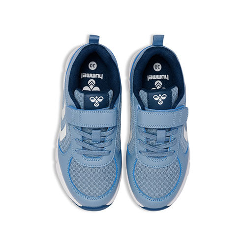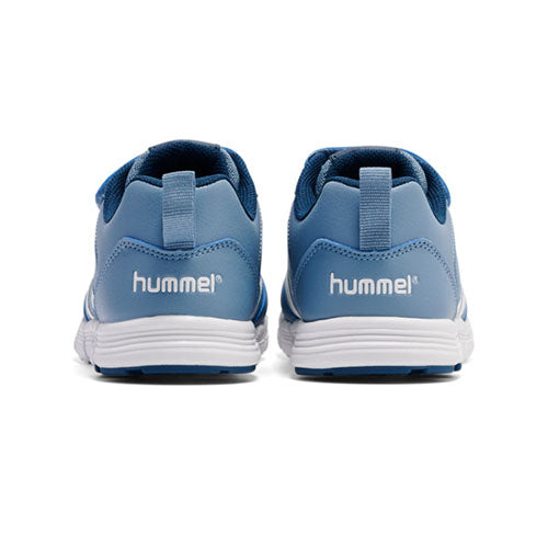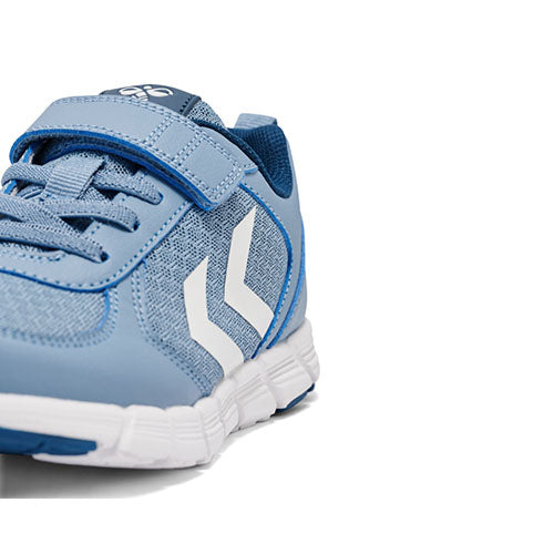 Lækker Speed JR sneaker med en overdel af imiteret glat skind og meshtekstil med hvide hummel-vinkler på siderne. Skoen lukkes med en velcrorem over vristen, imens en ikkejusterbar elastiksnøre sørger for løbende tilpasning til foden i løbet af dagen, og en trækfane på hælen gør det nemt at træde i skoen. Åbningen er godt polstret for øget komfort og støtte. Indersålen kan tages ud, og den fleksible ydersål med EVA-indsats og gummibelægninger er stødabsorberende med et godt fodfæste. Speed JR er en let og åndbar løbemodel skabt til timevis af aktivitet og leg.