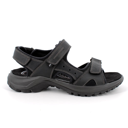 Lækker sandal med en overdel af glat skind. Lukkes med tre velcroremme (forfod, vrist og hæl) for optimal tilpasning til foden. Den polstrede dæksål er anatomisk og komfortabel, imens den fleksible ydersål er stødabsorberende og giver et godt fodfæste.
