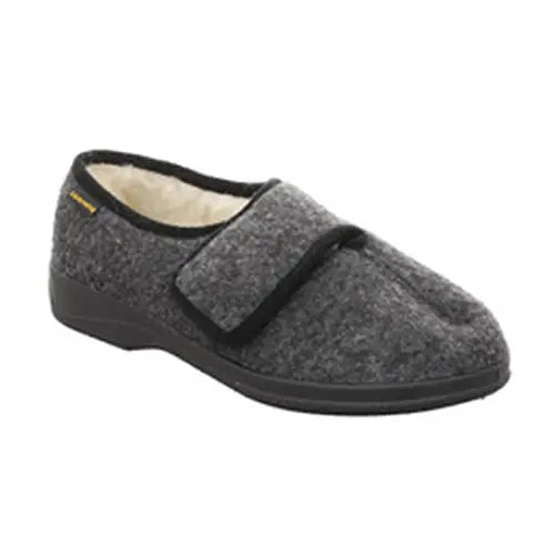 Lækker hjemmesko med en overdel af filt med et varmt uldfoer. Hjemmeskoen er en lukket model med hælkappe, og den lukkes med en bred velcrorem over vristen. Hjemmeskoen er desuden bred med god plads om forfoden. Den meget fleksible ydersål har et komfortabelt hældrop, beskytter mod kulde fra underlaget og er stødabsorberende med et godt fodfæste.