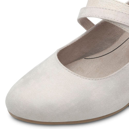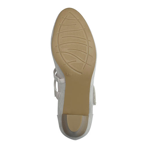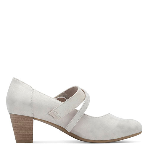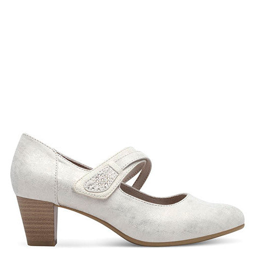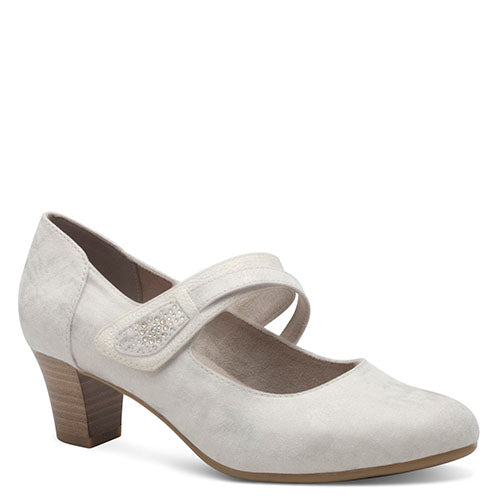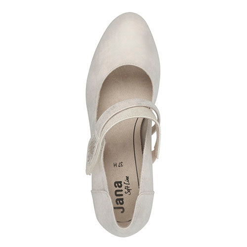 Flotte pumps fra Jane Soft Line-serien med en overdel af tekstil med metalprint. Skoen lukkes med en smart todelt velcrorem over vristen, dekoreret med glitrende sten. Den polstrede indersål er ekstra komfortabel, og med en vidde H-læst er der god plads til den bredere fod. Ydersålen under forfoden er af gummi og giver et godt fodfæste, og den robuste hæl med 5 cm højde har et flot trælook. 100 % vegansk.