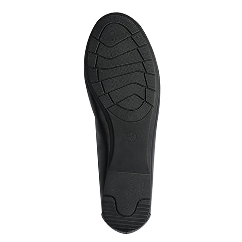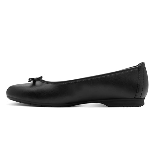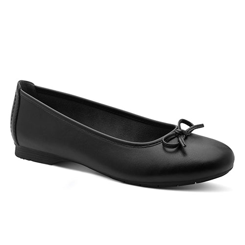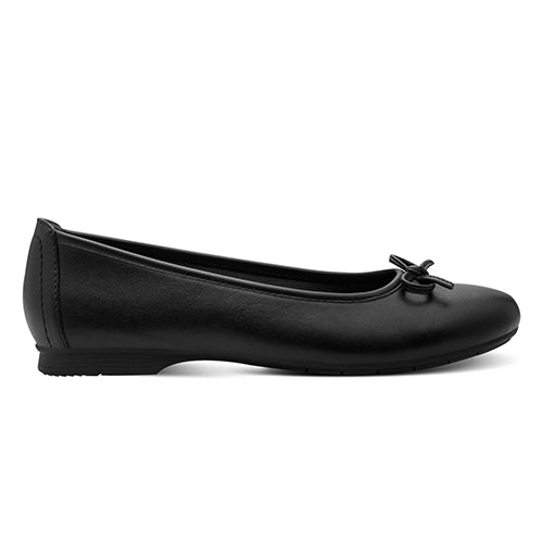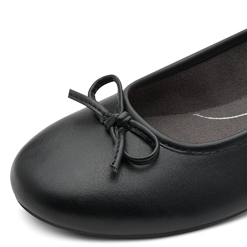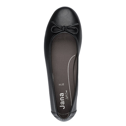 Smart og komfortabel Jana Soft Line ballerinasko med en overdel af imiteret glat skind, dekoreret med en sløjfe på forfoden. Soft Line-indersålen er blød og komfortabel, og med vidde H er der plads til den bredere fod. Den fleksible gummiydersål er stødabsorberende og giver et fint fodfæste. Er 100 % lavet af ikkeanimalske materialer.