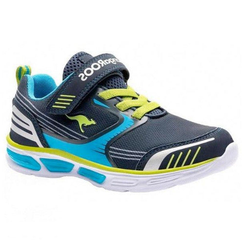 Kangaroos blinke sko i flotte farver. Skoene lukkes over vristen med en praktisk velcrorem, og de har elastiske snørebånd over foden. Skoen er godt polstret med tekstil, og lysene kan tændes og slukkes. Skoene er lavet i et blødt og isolerende materiale. Ydersålen er lavet af gummi.