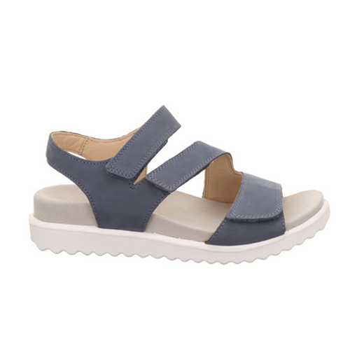 Dejlig sandal med en overdel af blød nubuck. Sandalen lukkes og tilpasses til foden med tre velcroremme over forfoden og vristen. Den polstrede og tekstilbeklædte dæksål er komfortabel og støddæmpende med et diskret løft. Den fleksible og lette ydersål er stødabsorberende med et fint fodfæste.