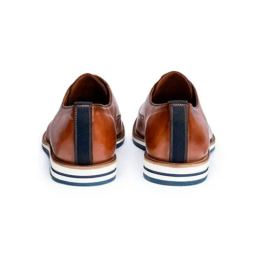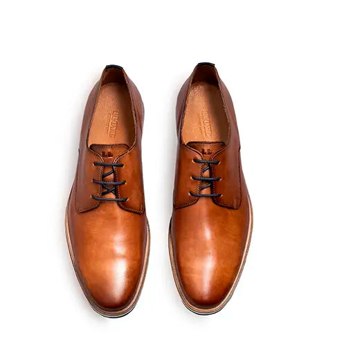 Klassisk og elegant Dakin sko med en overdel af glat læder med en stribe mørkeblåt tekstil på hælen. Skoen lukkes med snørebånd, og skindindersålen er polstret under hælen. Den fleksible gummiydersål med den karakteristiske røde Lloyd-stribe under hælen er stødabsorberende med et fint fodfæste. Fås i halve størrelser.