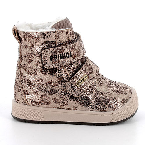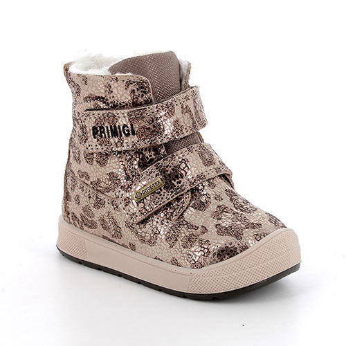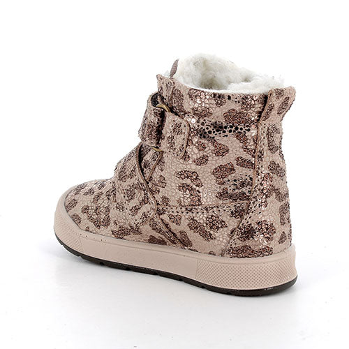 Dejlig vinterstøvle med en overdel af lamineret ruskind med tryk (dyreprint) og en pløs med tekstil. Støvlen lukkes med to velcroremme, og en trækfane bagpå hjælper med at træde i støvlen. Indvendig har støvlen et varmt uldfoer, og sammen med en åndbar og vandtæt GORE-TEX®-membran holdes fødderne varme og tørre. Den udtagelige indersål med filt er åndbar og anatomisk, og den fleksible ydersål er stødabsorberende med et fint fodfæste.
