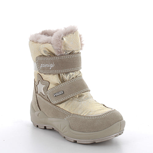 Superflot vinterstøvle med en overdel af ruskind og guldmetallisk syntet (lamineret tekstil), dekoreret med et stjernemotiv på ydersiden. Skaftets inderside er beklædt med blød, imiteret pels, som er synlig om åbningen. Støvlen lukkes med to justerbare velcroremme, og en trækfane bagpå gør det nemt at træde i støvlen. Indvendig har støvlen et varmt foer af Gore-Tex-uld, og sammen med en åndbar og 100 % vandtæt Gore-Tex-membran holdes fødderne varme og tørre i vintervejret. Den udtagelige indersål er beklædt med uld, og den fleksible ydersål er stødabsorberende med et godt fodfæste.