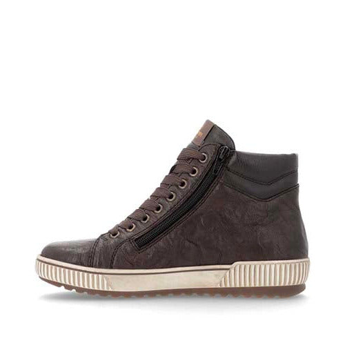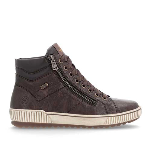Lækker ankelstøvle med en overdel af glat skind og syntet med en karakterfuld struktur for at understrege det urbane look. Støvlen justeres med brede snørebånd og lukkes med to lynlåse på siderne af snørebåndet. Åbningen er let polstret, og med vidde G er støvlen mere rummelig. Indvendig har støvlen et let foer, og Remonte-Tex-teknologien gør støvlen kraftig vandafvisende. Den udtagelige Remonte-soft-indersål er støddæmpende og komfortabel, og den fleksible gummiydersål er stødabsorberende med et godt fodfæste.