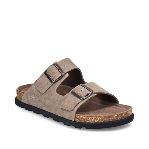 Lækker slippers-sandal med en overdel af ruskind foret med imiteret glat skind. To remme med justerbare spænder over forfod og vrist holder foden på plads, godt assisteret af den forholdsvis dybe fodskål. Sandalen har ekstra vidde, og dæksålen er polstret, blød og komfortabel samt beklædt med ruskind for optimal komfort og godt fodklima. Ydersålen er stødabsorberende med et fint fodfæste.