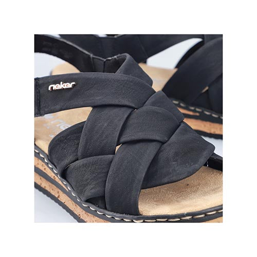 Smart sandal med en overdel af syntet i bredt flet dekoreret med et guldfarvet metallogo på ydersiden. Med elastikkiler på inder- og ydersiden af anklen tilpasser sandalen sig foden i løbet af dagen. Indersålen er komfortabel, og den fleksible ydersål er stødabsorberende med et fint fodfæste. Sandalen er ekstra feminin med den 4,5 cm høje kilehæl, der føles som blot 2,5 cm med den ca. 2 cm høje plateausål under forfoden.