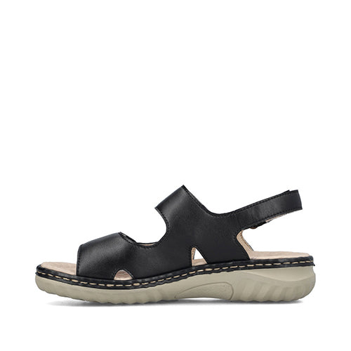 Dejlig og let sandal med en overdel af belagt skind. Sandalen lukkes med tre velcroremme (forfod, vrist, hæl) med en smart lakdetalje på remmen over vristen. Sandalen har komfortvidde, der giver mere plads til tæerne, og den skindbelagte indersål er polstret og komfortabel. Ydersålen er stødabsorberende med et fint fodfæste.