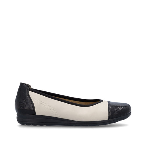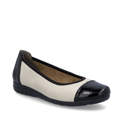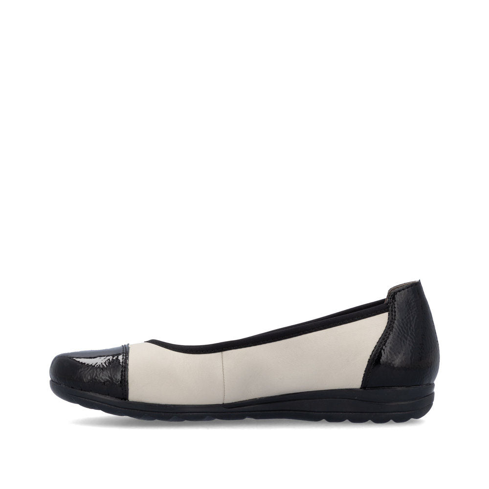 Komfortabel ballerinasko i en flot sort og beige farvekombination, som udstråler stil og finesse med sort lak på snuden og bagpå. Skoens overdel er lavet af skind og syntet, og indvendigt byder den på en skindsål. Den fleksible gummiydersål er stødabsorberende med et godt fodfæste, og med Riekers Antistress-teknologi får du en sko, der tilmed er lettere og mere rummelig om forfoden.