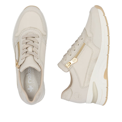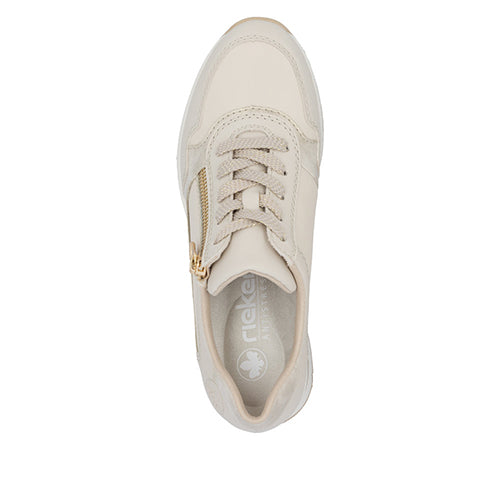 Flot sneaker med kilehæl. Overdelen er af glat skind og syntet og med metalliske detaljer. Skoen justeres med flade snørebånd med guldglimmer og lukkes med en lynlås på ydersiden. Indvendig har skoen et tekstilfoer, og den udtagelige indersål er polstret og komfortabel. Mellemsålen er stødabsorberende, og gummiydersålen giver et godt fodfæste. Den 5,5 cm høje kilehæl giver et flot, feminint look, og komforten bevares med 2 cm plateausål under forfoden.