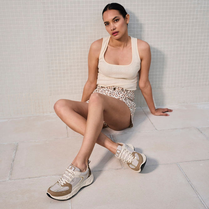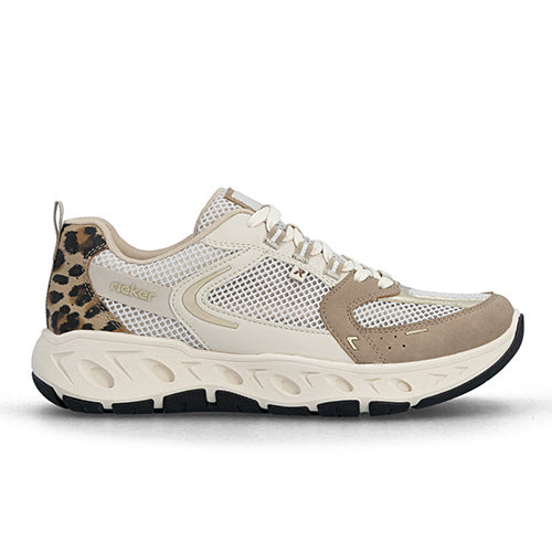 Flot og superlet sneaker med en overdel af luftigt meshtekstil og syntet i både nubuck- og skindlook. Skoen har mange flotte detaljer, bl.a. leopardprint på hælen, et "Rieker"-bånd på ydersiden og en detalje med metallisk effekt på forfoden. Skoen lukkes med snørebånd, og en lille trækfane på hælen gør det nemmere at træde i skoen, imens åbningen er polstret for øget komfort. Den udtagelige Soft-indersål med gel er støddæmpende og komfortabel, og den stødabsorberende ydersål med gummibelægning giver et godt fodfæste.