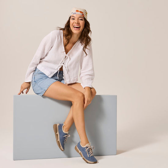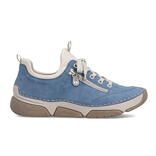 Dejlig sko med en overdel af syntet og tekstil dekoreret med en lynlås på ydersiden. Skoen lukkes med snørebånd, og trækfane på både hæl og pløs gør det nemt at træde i skoen. Indersålen er beklædt med skind, og den kraftige ydersål er stødabsorberende med et godt fodfæste.