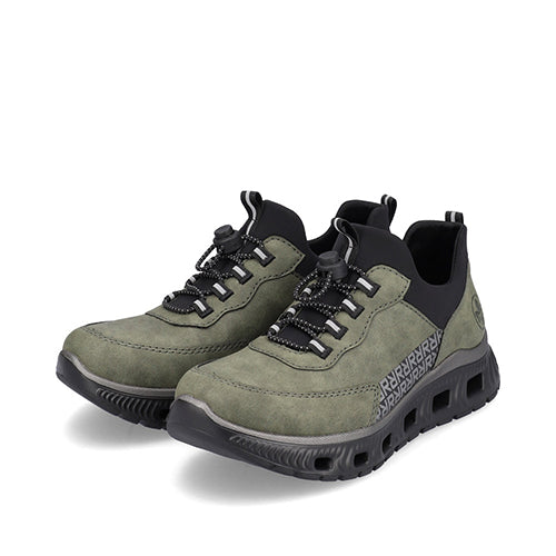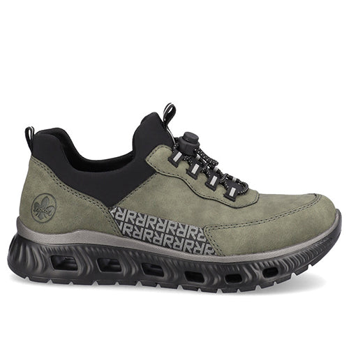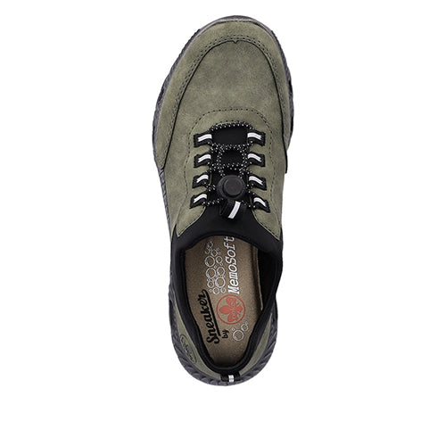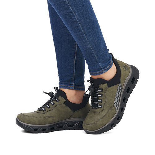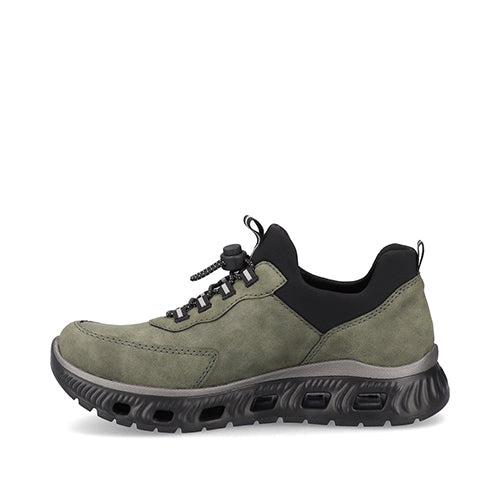Lækker, sporty og ultralet Lite-sko fra Rieker med en overdel af tekstil og syntetisk skind. Skoen er nem at træde i med den elastiske åbning samt den justerbare elastiksnøre, og trækfaner både for og bag gør det endnu nemmere at træde i skoen. Komforten er i top i denne sko med den ekstra bløde MemoSoft-indlægssål og den ekstremt lette og bøjelige ydersål, som sikrer kontinuerlig velvære, selv på lange dage. Herudover er skoen rummelig med G-komfortbredde, som giver rigelig plads til forfoden.