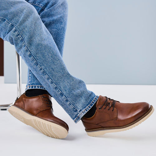 Flot sko med en overdel af glat skind, som ved snørebåndet er præget med et rudemønster, og snuden og hælen er lidt mørkere. Skoen lukkes med snørebånd, og åbningen er polstret for øget komfort og beskyttelse. Med vidde H-H½ er der plads til den bredere fod. Den komfortable indersål kan tages ud, og ydersålen er stødabsorberende med et fint fodfæste.