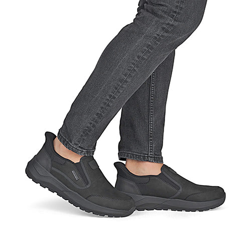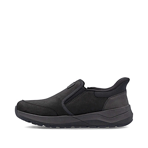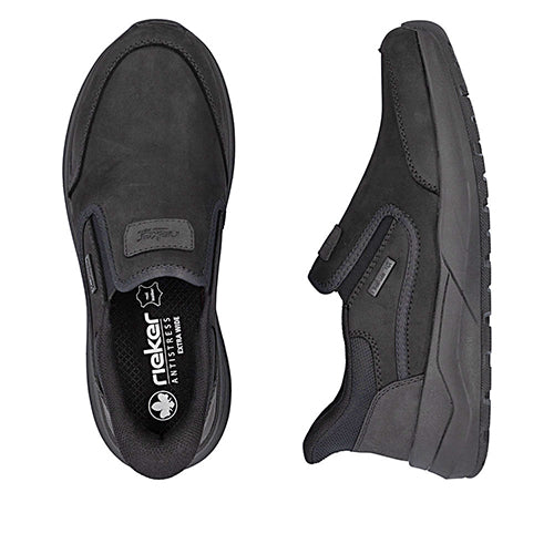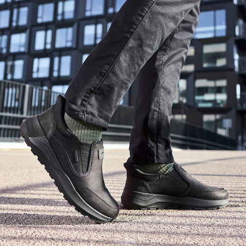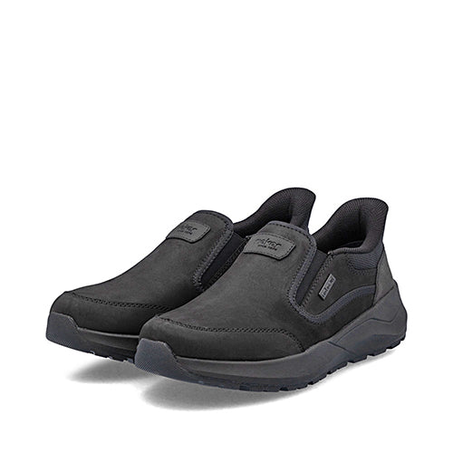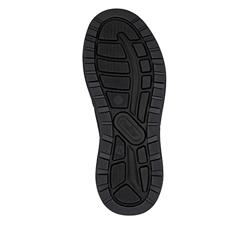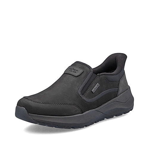 Smart Ready2GO hyttesko med RiekerTEX. Overdelen er af skind og syntet, og med Ready2GO får du en fast hælkappe, så det lige er til at stikke foden i skoen uden brug af dine hænder. Elastikkiler sørger for løbende tilpasning til foden gennem dagen. Med vidde H-H½ er der plads til den bredere fod. En RiekerTEX-membran gør skoen kraftigt vandafvisende, og den udtagelige indersål er komfortabel. Mellemsålen af CM-EVA er stødabsorberende, og den mønstrede gummiydersål giver et godt fodfæste.