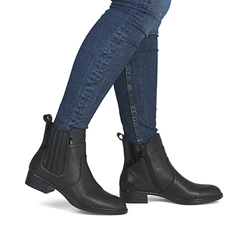 Klassisk ankelstøvle med smarte detaljer. Overdelen er af glat skind med krokopræget syntet om åbningen og et beklædt elastikpanel på ydersiden samt en trækfane bagpå. Støvlen lukkes med en lynlås på indersiden af anklen. Indvendig har støvlen et blødt, let og lunt fleecefoer, og indersålen er komfortabel. Ydersålen er fleksibel, og blokhælen giver et lille løft.
