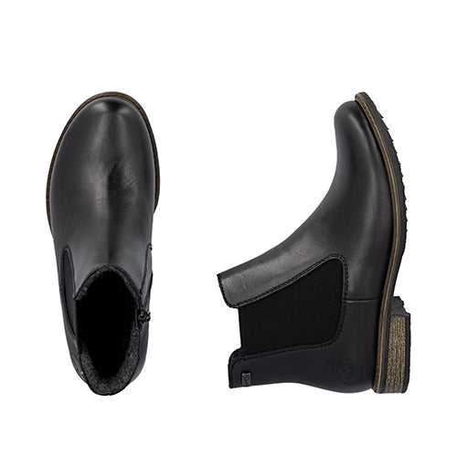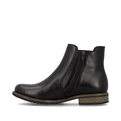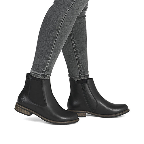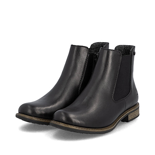 Klassisk ankelstøvle med en overdel af glat skind med et elastikpanel på ydersiden. Støvlen lukkes med en lynlås på indersiden af anklen. Med vidde H er der plads til den bredere fod. Indvendig har støvlen et blødt, let og lunt foer, og sammen med en kraftigt vandafvisende RiekerTex-membran holdes fødderne behagelige og lune. Den udtagelige indersål er polstret, åndbar, støddæmpende og komfortabel, og gummiydersålen er stødabsorberende med et fint fodfæste.