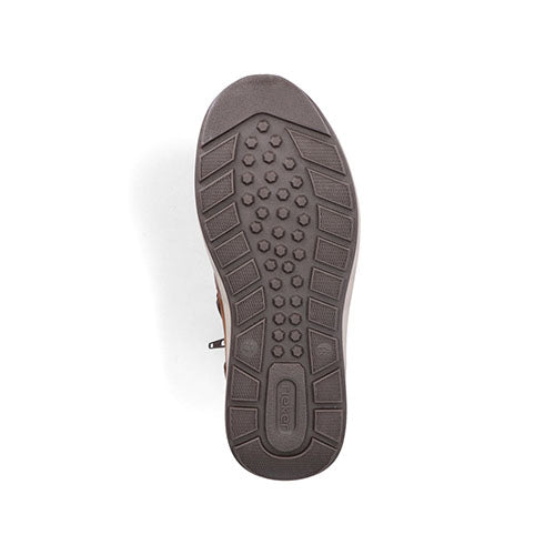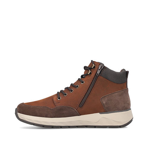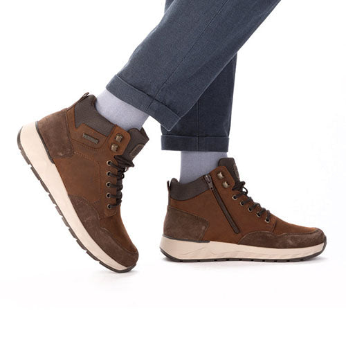 Dejlig vinterstøvle med en overdel af nubuck, ruskind og syntet foret med et varmt uldfoer, og med en RiekerTEX-membran er støvlen kraftigt vandafvisende, så fødderne holdes behagelige og varme. Støvlen justeres med snørebånd og lukkes med en lynlås på indersiden af anklen. Åbningen er polstret og har en trækfane bagpå. Med vidde H er der plads til den bredere fod. Indersålen kan tages ud, mellemsålen er stødabsorberende, og den mønstrede gummiydersål er stødabsorberende med et godt fodfæste.