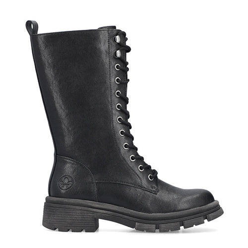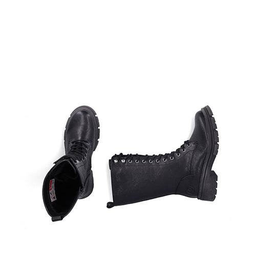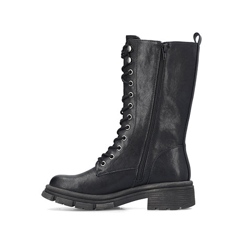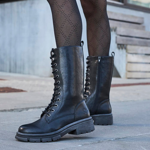 Smart støvle med medium længde skaft. Overdelen er af imiteret glat skind, og støvlen justeres med snørebånd og lukkes med en lynlås på indersiden af benet, imens en trækfane bagpå gør det nemt at træde i støvlen. Indvendig har støvlen et blødt, let fleecefoer. Indersålen er komfortabel, og den kraftige ydersål er stødabsorberende med et godt fodfæste.