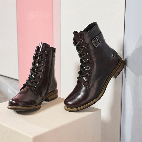 Flot støvle med en overdel af imiteret skind dekoreret med en rem med pyntespænde på siden. Støvlen justeres med snørebånd og lukkes med en lynlås på indersiden af anklen. Med vidde H er der plads til den bredere fod. Indvendig har støvlen et let, lunt fleecefoer. Den udtagelige indersål er polstret, støddæmpende og komfortabel, og den fleksible gummiydersål er stødabsorberende med et godt fodfæste.