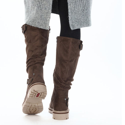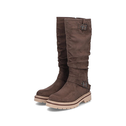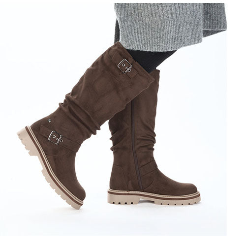 Flot langskaftet støvle med en overdel af blødt tekstil i et smart, rynket design, dekoreret med to spænder på ydersiden af henholdsvis skaftet og anklen. Støvlen lukkes med en lynlås på indersiden af benet. Indvendig har støvlen et blødt, let og lunt foer, og indersålen er komfortabel. Den kraftige ydersål har et godt mønster og er stødabsorberende med et godt vejgreb.