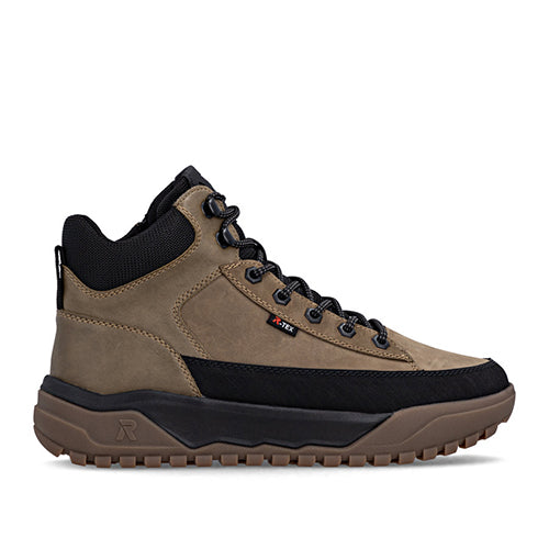 Kraftigt vandafvisende vinterstøvle med Rieker-TEX og en overdel af tekstil og syntet. Støvlen justeres med snørebånd og lukkes med en lynlås på indersiden af anklen, åbningen er godt polstret, og en trækfane på hælen gør det nemt at træde i støvlen. Med vidde G er der mere plads om forfoden. Indvendig har støvlen et varmt foer, og sammen med Rieker-TEX-membranen holdes fødderne varme og tørre. Den udtagelige indersål har Thermo-Foil og beskytter dermed ekstra mod kulde nedefra. Indersålen er desuden polstret og komfortabel, og den kraftigt mønstrede gummiydersål er stødabsorberende med et godt vejgreb.