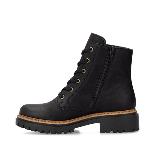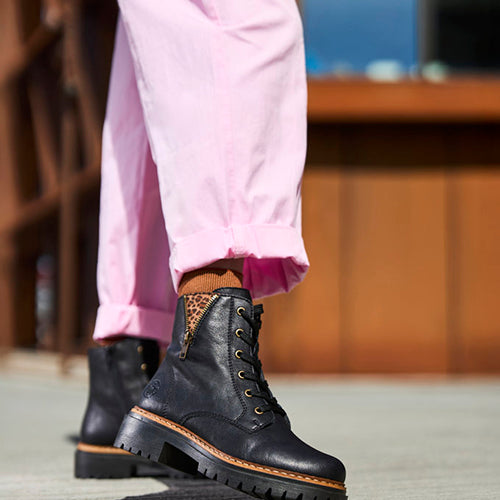 Smart støvle med en overdel af imiteret glat skind dekoreret med en lille, åben lynlås, der afslører leopardprint på ydersiden af anklen. Støvlen justeres med snørebånd og lukkes med en lynlås på indersiden af anklen. Indvendig har støvlen et let, lunt foer. Den kraftige ydersål er stødabsorberende med et godt fodfæste.