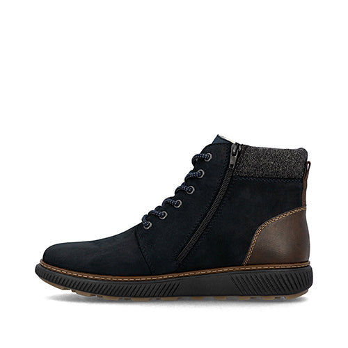 Dejlig ankelstøvle med varmt foer og Rieker-Tex. Overdelen er af nubuck og syntet, og indvendig har støvlen et varmt foer, der sammen med en kraftigt vandafvisende Rieker-Tex-membran sørger for varme og tørre fødder. Støvlen justeres med snørebånd og lukkes med en lynlås på indersiden af anklen. Åbningen er polstret for øget komfort, og med vidde H er der plads til den bredere fod. Den udtagelige indersål er polstret, støddæmpende og komfortabel, og den fleksible gummiydersål er stødabsorberende med et godt fodfæste.