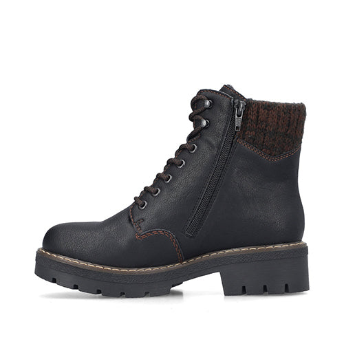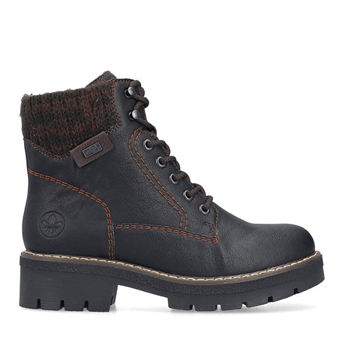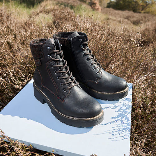 Lækker vinterstøvle med en overdel af imiteret glat skind og striktekstil om skaftet. Støvlen justeres med snørebånd og lukkes med en lynlås på indersiden af anklen. Indvendig har støvlen et varmt foer, og med en kraftigt vandafvisende RiekerTex-membran holdes fødderne behagelige og varme. Den udtagelige indersål er støddæmpende, polstret og komfortabel, og den chunky gummiydersål med et kraftigt mønster er stødabsorberende med et godt vejgreb.