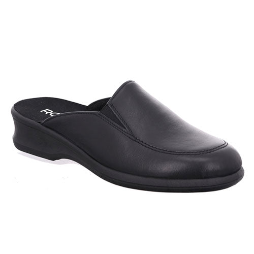 Lækker slippers-hjemmesko med en overdel af glat skind med en diskret moc toe-syning på forfoden samt elastikkiler ved åbningen. Indvendig har skoen et let, lunt foer, og den komfortable dæksål er beklædt med tekstil. Ydersålen er fleksibel og stødabsorberende, og den diskrete kilehæl giver et feminint look. Fås i halve størrelser.