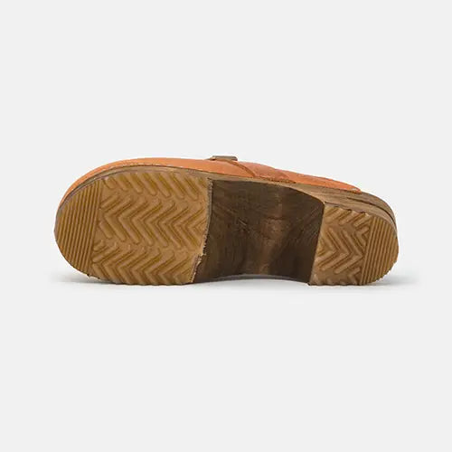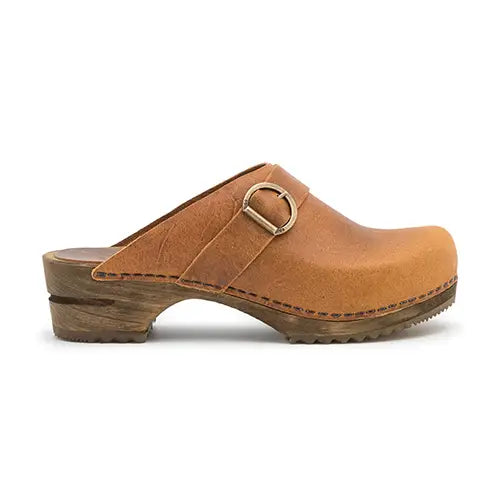 En flot version af en klassiker: Wood - Maria Open træsko med en mellemsål af ægte træ. Overdelen er af læder med den glatte side udad og det bløde ruskind ind mod foden. Overdelen er dekoreret med en rem med pyntespænde, og insteppet er råt. Indvendig er hælen beklædt med skind, og tåen er forstærket med syntet. Ydersålen er af slidstærk naturgummi.