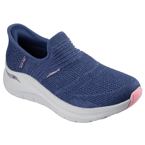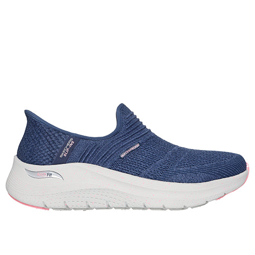 Vandtæt Slip-ins Arch Fit 2.0 - Right As Rain sko med svangstøtte. Overdelen er af let og åndbart striktekstil i en flot denimblå farve, og med Stretch Fit tilpasser skoen sig foden som en strømpeMed Skechers Hands Free Slip-ins-teknologien kan du nemt træde i skoen uden at bukke dig eller bruge dine hænder. Designet med en komfortabel Heel Pillow, som former sig efter din hæl og holder din fod sikkert på plads. Indvendig har skoen et let Skechers Breathe Easy Technology-foer, som giver 100 % vandtæt beskyttelse samtidig med maksimal åndbarhed. Den udtagelige Arch Fit-indersål giver god svangstøtte og maksimal komfort og hjælper med at forme sig efter din fod for at reducere stød og øge vægtfordelingen. Mellemsålen er stødabsorberende, og den fleksible ydersål med gummi på hæl og tå er stødabsorberende med et godt fodfæste. Her får du en smart, praktisk og komfortabel sko, perfekt til dagligdagen. Skoen er fremstillet af 100 % veganske materialer.