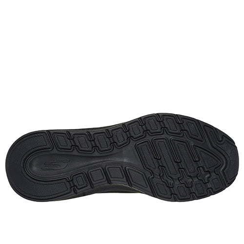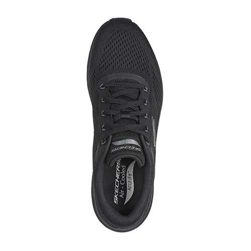 Lækker Arch Fit 2.0 - Black sko med svangstøtte. Overdelen er af åndbart mesh-tekstil, og skoen lukkes med snørebånd. Åbningen er polstret for øget komfort, og den udtagelige Arch Fit-indersål giver svangstøtte og består af Skechers Air-Cooled Memory Foam, så den er støddæmpende og øger vægtfordelingen under foden. Mellemsålen virker også støddæmpende, imens den fleksible ydersål med gummibelægning giver et godt fodfæste. Kan maskinvaskes ved maks. 30 grader - husk at tage indersålen ud først. Er fremstillet af 100 % veganske materialer.
