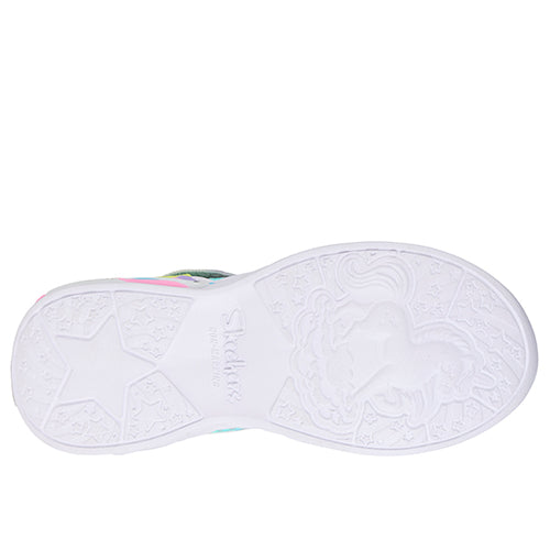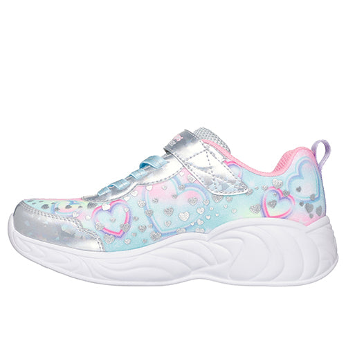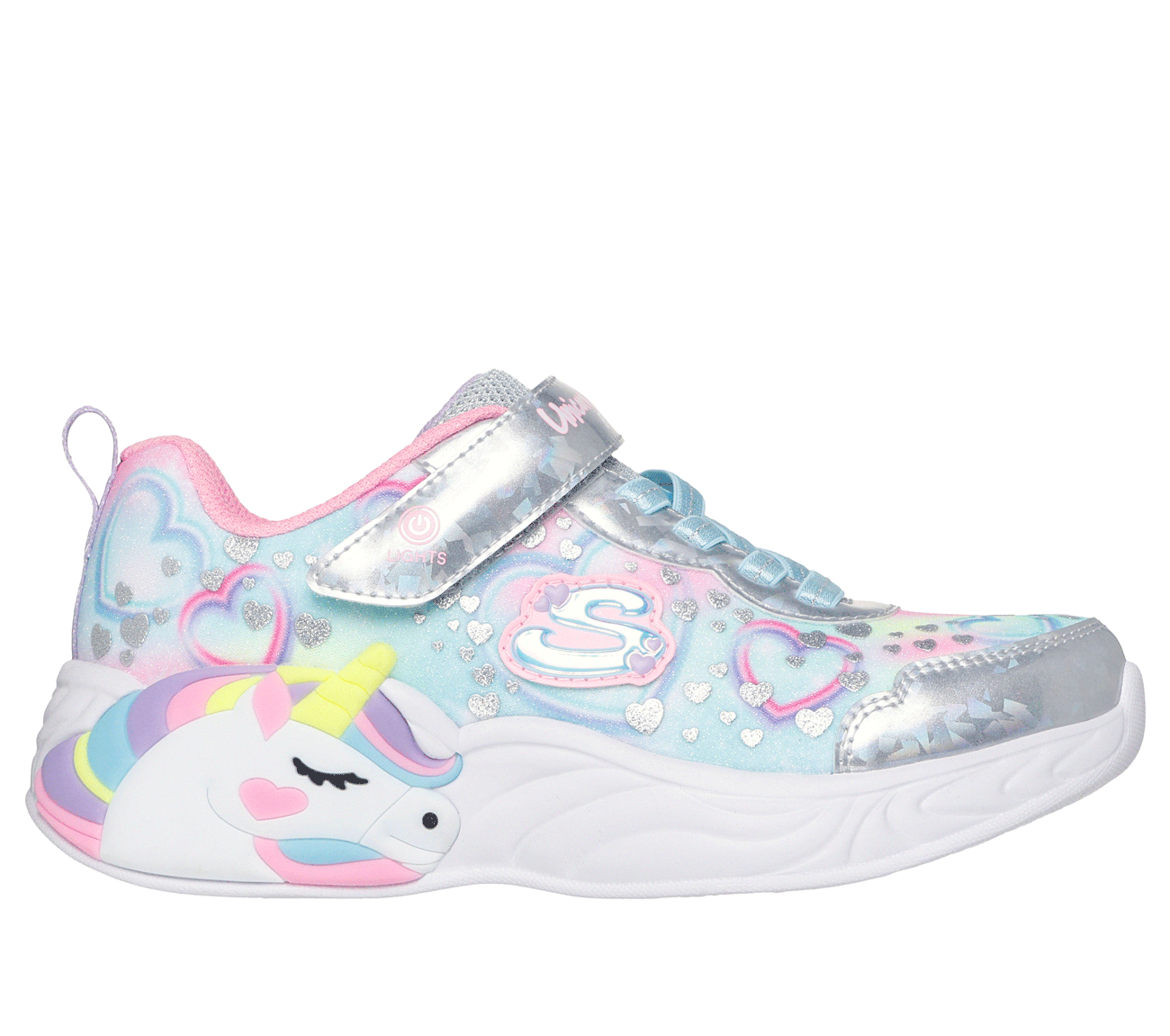 Superflot S Lights - Unicorn Dreams - Heart Sparkles sko med blink. Overdelen er af tekstil og syntet dekoreret med hjerter. Skoen lukkes med en velcrorem over vristen, som har en tænd-/slukknap for enden, imens en rund ikkejusterbar elastiksnøre sørger for, at skoen tilpasser sig foden i løbet af dagen. En trækfane på hælen gør det nemt at træde i skoen. Åbningen er polstret for øget komfort. Indersålen er komfortabel, og ydersålen er stødabsorberende med blink i den store, flotte enhjørning på ydersiden af sålens hæl.